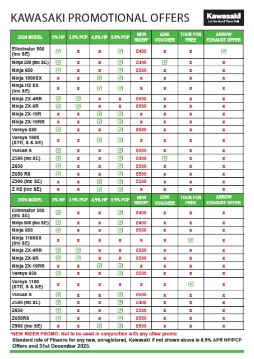 From October 1st Kawasaki have stepped up their offers and these now include a host of extra models. The offers include 0% HP finance on selected models along with low rate PCP and HP finance offers. This is joined by a superb FREE luggage offer on the bigger 1100cc tourer models. Plus the remainig Last years 2024 model Eliminators get a FREE Arrow exhaust system.