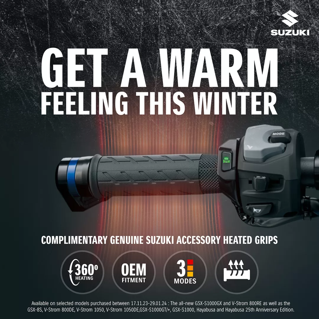 Get Suzuki OEM Heated Grips with all New Suzuki models, until January 31st. The Suzuki Heated Grips are a slick integrated design, with 3 heat settings, great for winter riding.