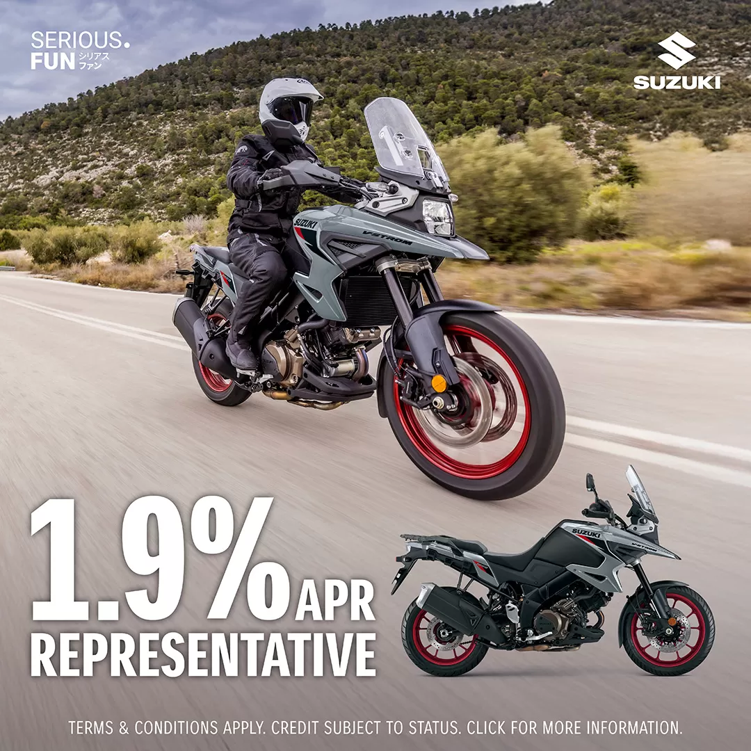 PCP Finance offer applies to the purchase of a new V-Strom 1050RE only from a participating Suzuki Dealership. The motorcycle must be purchased and registered between 12/01/2026 and 31/03/2026 to qualify for the offer. £500 minimum deposit required. Credit subject to status, UK residents aged 18+. Suzuki Financial Services Ltd, St.William House, Tresillian Terrace, Cardiff, CF10 5BH. Finance figures applicable at time of print and are subject to change. Representative Example is based upon an annual mileage of 4,000 miles per annum. With PCP, once you have paid all of the regular monthly repayments you have the option to: 1. Return the motorcycle and not pay the Optional Final Repayment. In this example if the vehicle has exceeded 12,333 miles, a charge per excess mile will apply of 6p plus VAT will apply per excess mile. If the motorcycle is in good condition (fair wear and tear accepted) and has not exceeded the maximum agreed mileage, you will have nothing further to pay, 2. Pay the Optional Final Repayment to own the motorcycle, or 3. Part exchange the motorcycle subject to settlement of your existing credit agreement; new credit agreements are subject to status.
