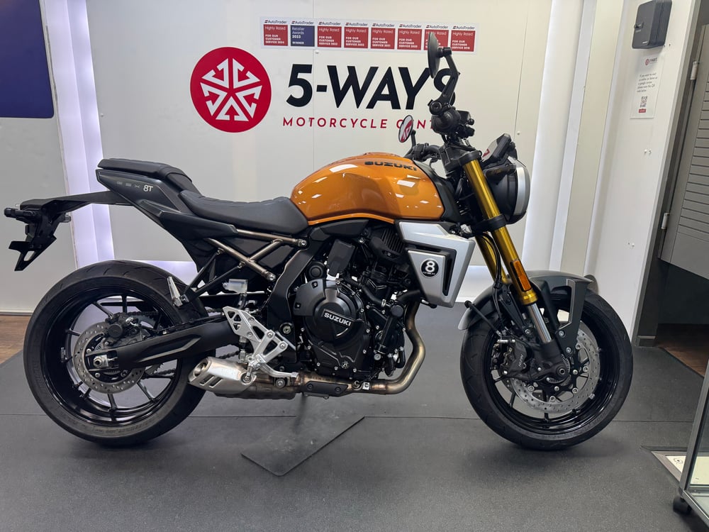 Amazing value with a big saving from RRP, free heated grips and low rate finance. This bike is brand new with zero miles. Comes with full Suzuki benefits 10yr Service activated warranty, 1 year’s free AA road side assistance and Suzuki’s service promise. We are 8-times winners of the Autotrader “Highly Rated” award and Autotrader Motorcycle Retailer of the Year 2023. Please read our reviews, we pride ourselves on delivering outstanding customer service. RETRO SPIRIT, NEXT GENERATION PERFORMANCE. As franchised motorcycle retailers we deliver top quality motorcycles prepared to the very highest standards by our manufacturer trained and approved technicians. Buy with confidence – we are a 2nd generation family fun dealership, established in 1980. View our website page “Why 5-WAYS” for more information on our dealership and what makes buying from us a pleasure. Please note that the price advertised does not include the DVLA first registration fee of £55 or road tax. Delivery available throughout the UK Mainland. Contact us for a bespoke quote.
